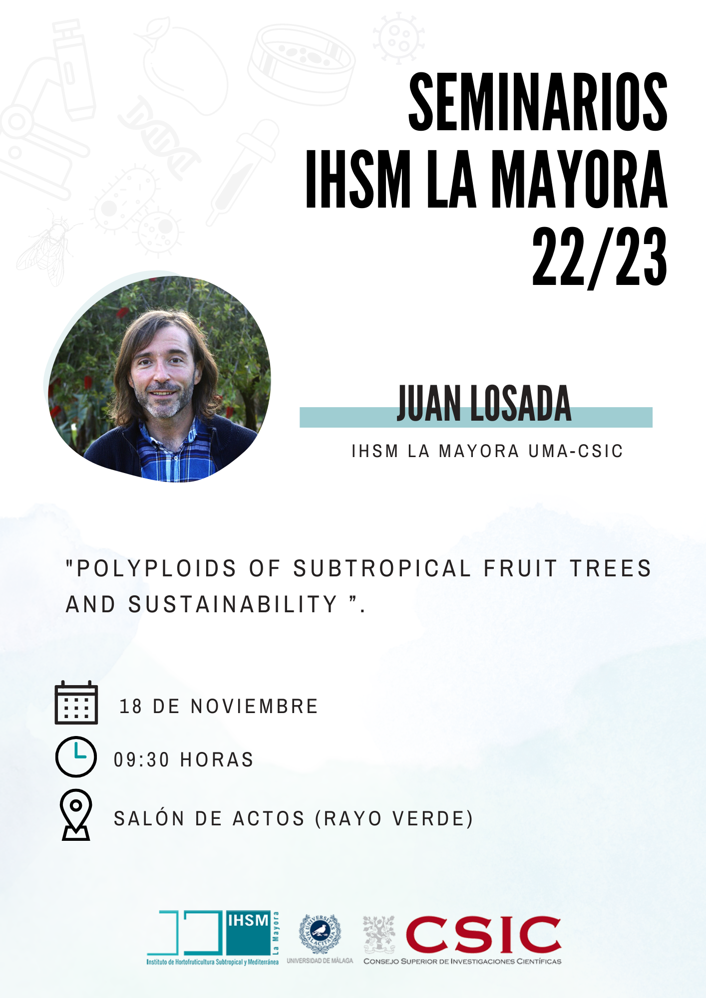 POLYPLOIDS OF SUBTROPICAL FRUIT TREES AND SUSTAINABILITY Climate change predictions point to a growing risk of desertification in susceptible areas of the world, such as the Mediterranean basin, jeopardizing the survival of trees and their edible products. Thus, looking for new fruit tree varieties with drought resistance appears as a major goal for a more sustainable fruticulture. In this Seminar, I highlight the importance of the unique germplasm collections of the IHSM in searching for more resilient varieties to the stressful conditions generated by climate uncertainties. Our approach combines aspects of genetics, development, and cell biology to better understand the anatomy and hydraulics of subtropical fruit trees with different chromosome numbers, as well as their physiology under soil water scarcity. The final goal is to generate models that predict fruit tree performance as a function of ploidy under climate change scenarios.