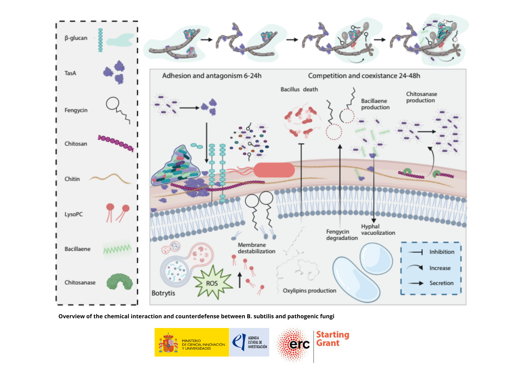 Investigadores del IHSM La Mayora (UMA–CSIC) han descubierto cómo Bacillus subtilis utiliza su “matriz” de biofilm no solo como un andamiaje protector, sino también como un arma activa para controlar a Botrytis cinerea, el hongo causante de la podredumbre gris en numerosos cultivos. El estudio muestra que TasA, un componente esencial de la matriz extracelular de Bacillus, le ayuda a adherirse firmemente a las hifas fúngicas y daña directamente la pared celular del hongo al alterar la capa de β-glucano, lo que a su vez compromete su estructura y fisiología. Además, Alicia I. Pérez-Lorente y colaboradores demuestran que TasA actúa en conjunto con el lipopeptido antifúngico fengicina: mientras que fengicina ataca las membranas del hongo y desencadena fuertes respuestas de estrés, TasA induce cambios metabólicos y estructurales distintos en el hongo. De forma destacada, el equipo liderado por el Prof. Diego Romero observó que TasA puede actuar como transportador del compuesto antimicrobiano bacilaene, también producido por B. subtilis, potencialmente estabilizándolo y potenciando su efecto fungistático. Esta interacción es dinámica: Botrytis responde al ataque de Bacillus mediante el despliegue de un conjunto de medidas defensivas que le permiten adaptarse, como la ramificación de hifas, la formación de clamidosporas y contramedidas químicas. Este trabajo, por tanto, demuestra la complejidad de las interacción microbianas, y descubre nuevos elementos clave en el desarrollo de dinámicas microbianas, desde la competición a la coexistencia.